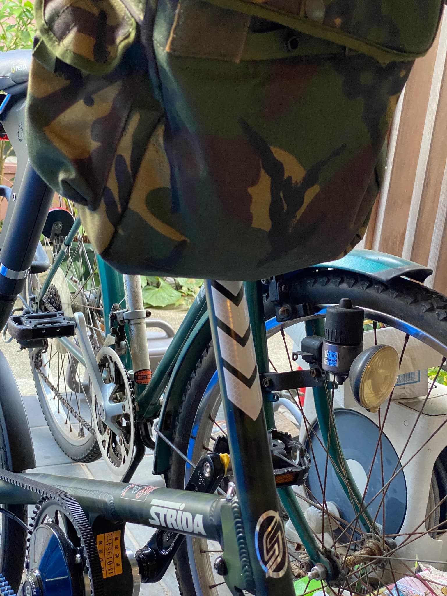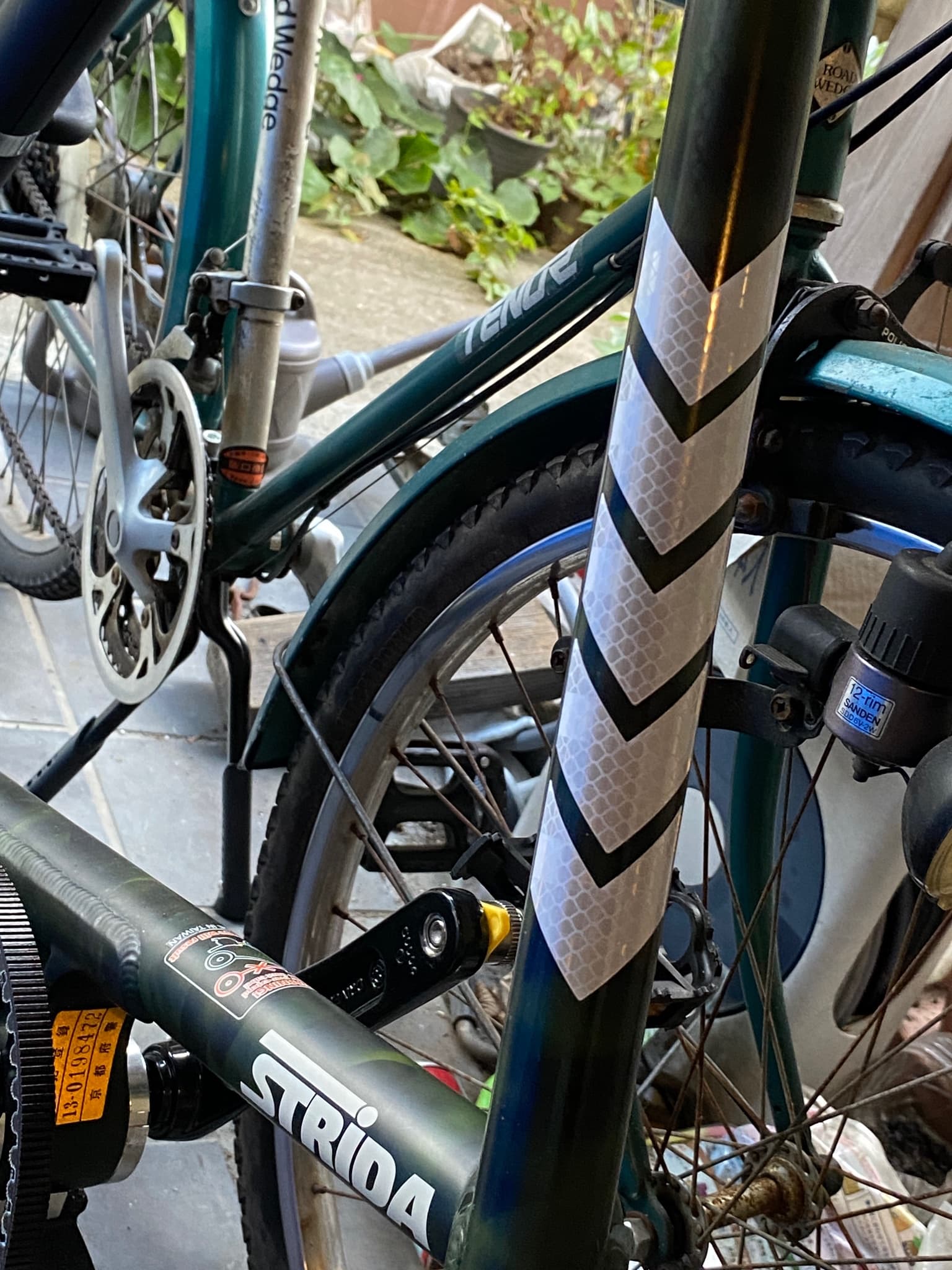 I then stuck down five pieces of chevron-shaped reflective tape I bought on Amazon… I should have measured the gaps and the horizontal and vertical alignment properly, but I just eyeballed it… I usually have a bag attached, so maybe three pieces would have been enough.![]()